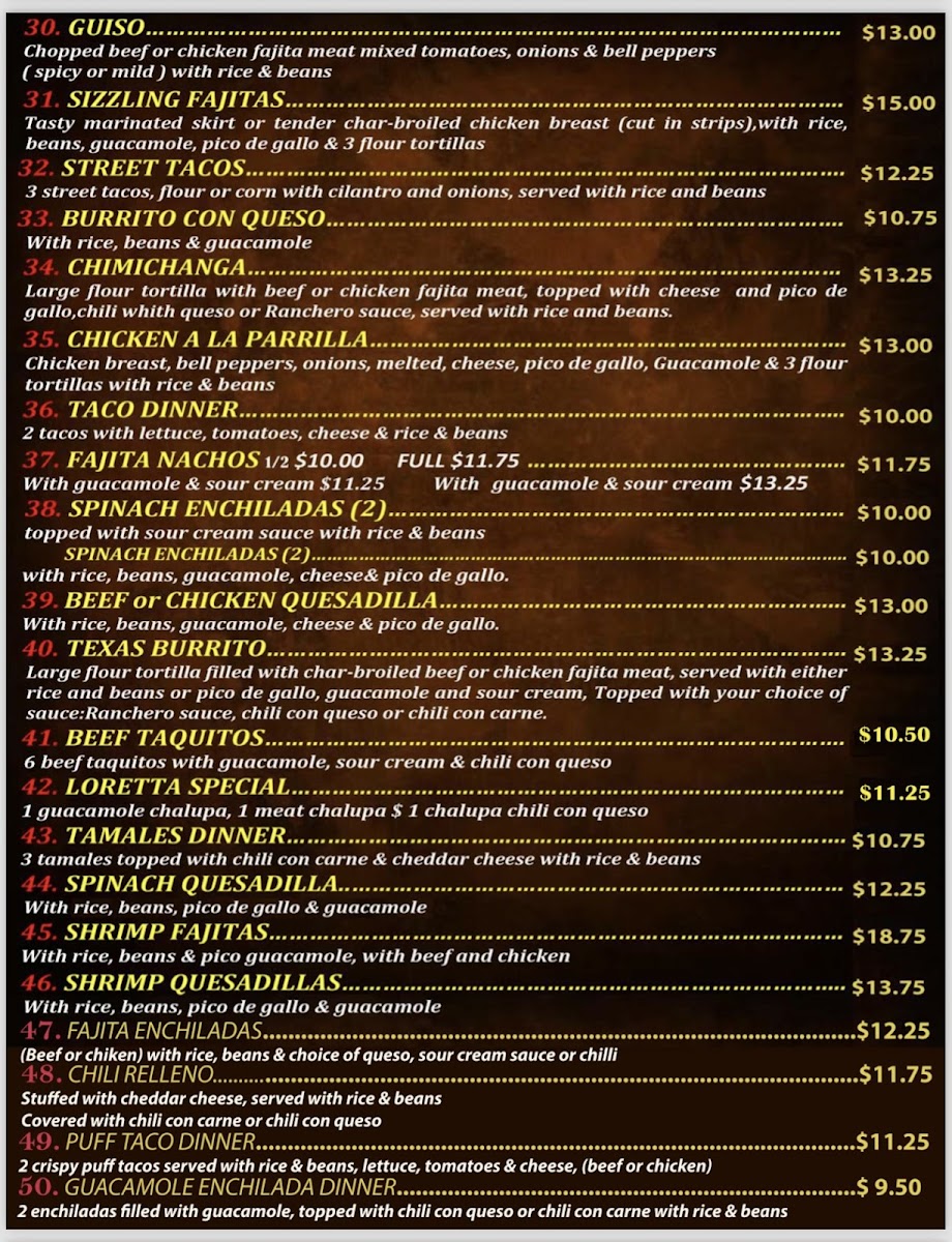 The menu is a delightful journey through Mexican cuisine, featuring a variety of nachos—from the indulgent Supreme Nachos at $9.00 to the classic Cheese Nachos for $6.50. Allergic to cheese? There's something for everyone with options like Chicken and Meat Nachos priced around $8, and the exciting Fiesta Nachos at $10.25.